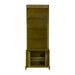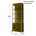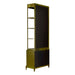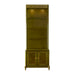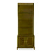 Defined by elegant Regency lines, this tall oak etagere features four shelves (three being glass) with two dimmer-controlled LED lights. A two-door cabinet with interior shelving has custom solid brass pulls and center panels of olive ash burl. Finished in a lightly brushed, deep rich olive green topped by an oh-so-subtle matte gold glaze that highlights rift-cut oak's natural grain.