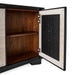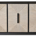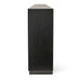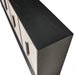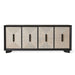 White Danish cord is woven in a diamond pattern on four doors featuring rectangular black pulls. Crafted of mahogany and mindi wood with a satin black finish. Each of two compartments have one adjustable shelf and wire management access.