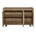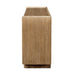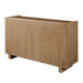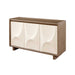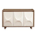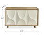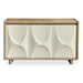 Deeply sculpted hardwood doors have the feel of plaster, with a milk-color lacquer finish. Two compartments each have one adjustable shelf and wire management access. Crafted of heavily brushed quartered American white oak with natural-tone finish and cream-colored ceruse. The cabinet is completely finished on all sides.
