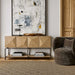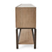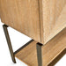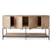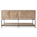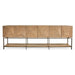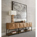 The sculptural form of the Trapezoid Cabinet floats over a tall bronze finished base with one shelf. The cabinet made of solid wood and quartered heavily brushed American white oak, features four doors that open into two separate compartments, each with wire management access. Finished in a natural-tone with white ceruse.