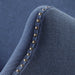 Contemporary Style Can Be Found In This Solidly Constructed Wing Chair. Featuring A Denim Blue Linen Blend Fabric Accented With Antique Bronze Nail Head Trim, On Slightly Tapered Oak Legs In A Weathered Sandstone Finish With A Light Tan Glaze.