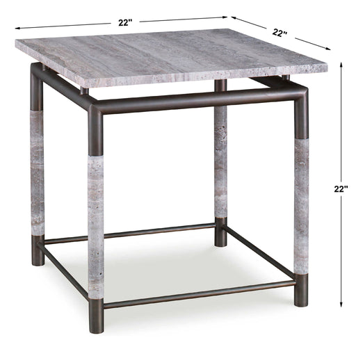 RevelationThe Suspended Side Table features a porous gray and beige stone top, floating above a clean architectural base in a rich bronze finish with coordin...
