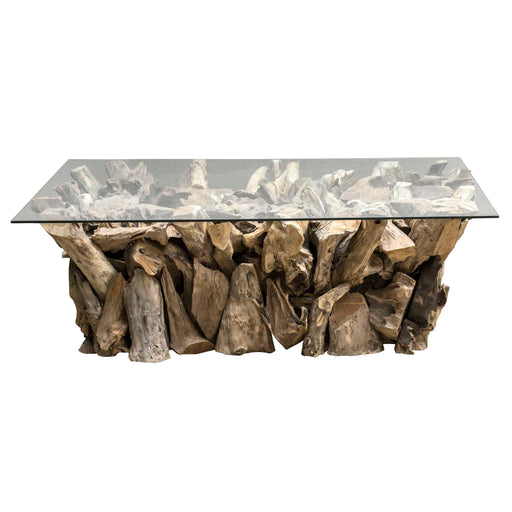 RevelationNatural, unfinished teak wood sculpted into a dramatic table with a thick, clear glass top.Product Features75% Wood (Teak Root & Twig), 25% Gla...