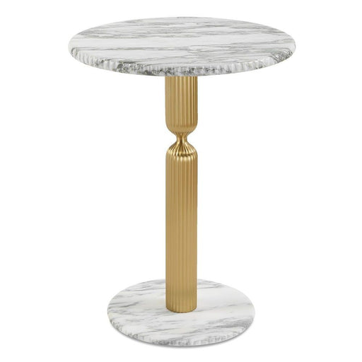 RevelationThis pretty table features cast brass fluted piping with a cinched detail. A circular top and base are crafted of honed Italian Arabescato marble. ...