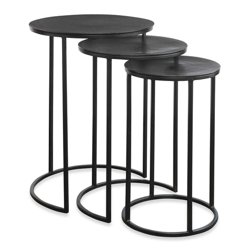Salt & LightSet of three iron nesting tables finished in a rich espresso. Sizes: Small: 12" x 12" x 20"; Medium: 14" x 14" x 21.7"; Large: 17" x 17" x 23.7".Pr...