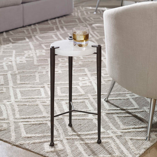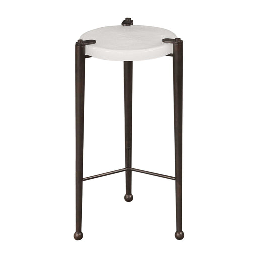 Salt & LightThis round iron accent table, finished in nickel, is anchored with a thick white marble base. Rest your cup of coffee or favorite book on the tempe...