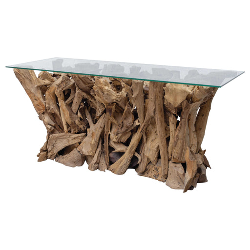 RevelationNatural, unfinished teak wood sculpted into a dramatic table with a thick, clear glass top.Product Features75% Wood (Teak Root & Twig), 25% Gla...