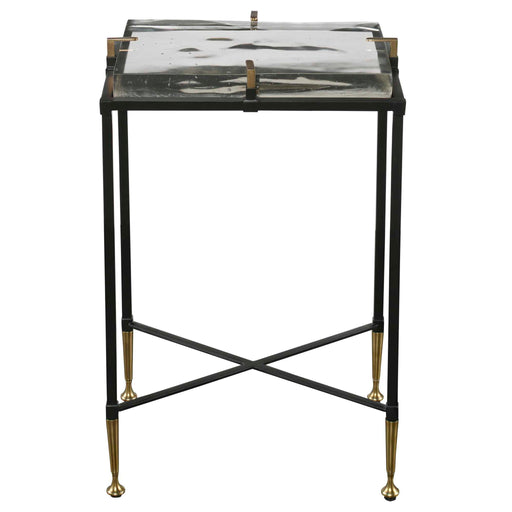 RevelationThe Ice Block Table has an impressive 1 1/2" thick seeded glass top held in place with four solid brass clips. Made of solid iron with a black fini...