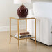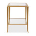 This end table, made of iron and finished in a gold leaf, features top and bottom shelves made of tempered glass, each with a 1 cm bevel. The top of the frame has a subtle flare that adds shape to the design, complementing the flared legs.
