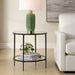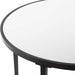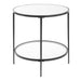 This round end table is crafted from sturdy iron and finished in a satin black for a versatile and contemporary look. The top shelf features a mirrored glass surface, while the bottom shelf is made of tempered glass, offering style and durability.