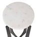 Crafted with a sturdy iron frame, this accent table features four slender legs that gracefully converge and connect at the base. The white marble top rests seamlessly within the upper ends of each leg for a clean, integrated look. The frame's brass bronze