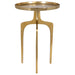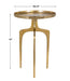 The unique design of this accent table features three curved legs and a solid round top, which is accented with a .75" raised lip. This cast aluminum table is finished in a slightly textured soft gold. Perfect beside your favorite chair.