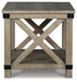Crafted with solid pine wood treated to a weathered gray finish, this end table is rustic farmhouse living at its best. Crossbuck styling adds striking flair. Metal industrial brackets incorporate an industrial twist.