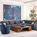 Curves and corners playfully juxtapose to create the sculptural Bolster Coffee Table. The large-scale top features squares of olive ash burl that were hand-selected to amplify a unique swirl pattern. The top is nestled into quartered American white oak bolster-shaped legs. Ideal for large seating groups or modular seating.
