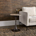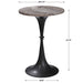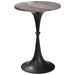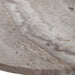 Traditionally shaped with updated materials, featuring a uniquely porous buhrstone marble top in light tan tones, atop a steel base finished in oil rubbed bronze. Due to the unique characteristics of natural materials, each piece will vary slightly.