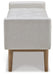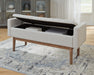 Details | Made of polyester and wood, Polyester fabric upholstery, Tufted seat cushion, Wood legs in light brown finish, Hinged seat with storage, Assembly required | |