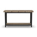 Showcase your family photos or display your cherished collectibles with the Carpenter sofa table. Versatile enough to stand on its own in an entryway or as a companion to a sofa or sectional, this table features a planked wood top and an open lower shelf to offer ample display area. Hand-worked metal frames and exposed bolt heads provide an industrial vibe, while distressed acacia planks give a reclaimed, rustic look. This table's light brown rustic style is sure to elevate your living space.