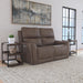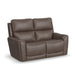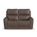 Power up and enjoy secretive perks with the Carter power reclining loveseat. Customize your comfort with adjustable recline, headrest and lumbar support on both seats, including reclining to a Zero Gravity position for a weightless experience, reducing pressure on joints. This loveseat will be a statement in your home with its genuine leather look that is a durable, easy to clean fabric in a cappuccino brown color, and Flexsteel's patented Blue Steel Spring™ at the heart of each seat for ultimate durability. Flared arms, a contoured seats and heavy thread stitching details give it a sleek, yet striking look. And it all comes with pop-out cupholders in the arms for discreet storage.
