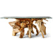 Nature has sculpted the beautiful Center Root Console Table. It is a stunning art piece that provides beauty and function. Made from the ball root of a plantation-grown teak tree, it is meticulously finished by artisans. Every table will vary ensuring its uniqueness. 74" x 17" glass included.