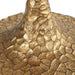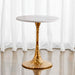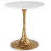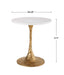 An elegant and graceful table made of cast iron with a dramatic hammered texture, finished in an antique gold leaf with a honed white marble top. Its light look and size make it a perfect sofa or chair side table. Because of the natural characteristics of marble, each piece will have unique veining patterns.