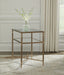 This end table gives traditional design a wonderful sense of relevance. Its details, which include embellished legs and a stretcher with a decorative center finial, are timeless classics. The aged goldtone coloration is the essence of relaxed elegance. An underlying shelf adds style, substance and functionality.