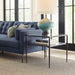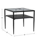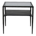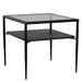 A soft hammered frame in satin black finish provides twice the storage and visual display. The top tier holds floating glass while the base tier is solid black granite with a leather-like finish.