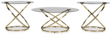 Details | Includes coffee table and 2 end tables, Made with metal and glass, Champagne goldtone finish, Clear tempered glass tabletop, Assembly required | |
