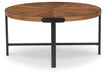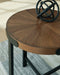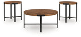 Details Includes coffee table and 2 end tables, Made with acacia wood veneer, MDF substrate and metal, Tops with rich brown finish, Legs with durable dark bronze-tone powder coat finish, Starburst veneer pattern, Assembly required