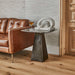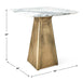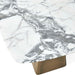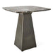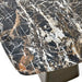 A rounded square top of honed Arabescato marble shows natural veining at its most dramatic. No two will be quite alike. Underneath, a steel obelisk base has a rich antique finish.