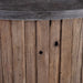 Trimmed in alternating slats of raised recycled elm wood, featuring a solid waxed bluestone top with natural characteristics of white marbling and veining throughout. Solid wood will continue to move with temperature and humidity changes, which can result in small cracks and uneven surfaces, adding to its authenticity and character.