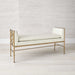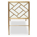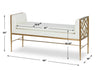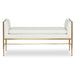 Made of steel with a rich, light antique brass finish, this modern bench's sides were inspired by historic Chippendale fretwork. The seat has high density foam, wrapped with Dacron and is covered in winter white top grain leather. Tapered feet add a sophisticated detail. .