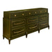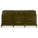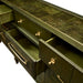 Inspired by elegant Regency design, the nine drawer chest is embellished with custom solid brass pulls and inset brass framing olive ash burl panels. The body is brushed quartered oak. Tapered legs keep the feel light and airy. All are finished in unique deep rich olive green finish with matte gold ceruse that subtly highlights quartered oak linear grain.