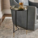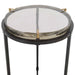 The Ice Block Table has an impressive 1 1/2" thick seeded glass top held in place with three solid brass clips. Made of solid iron with a black finish, featuring beautiful solid brass feet, all lending itself to a found antique treasure. It is the perfect chair side table that will blend well into any style room. With the use of recycled glass, each piece will be unique and may have slight imperfections.