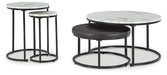 Raise the bar on contemporary form and function with this versatile nesting table set. Its faux Carrara marble tabletops pair with tubular metal frames in a dark finish for a simply chic look that's so striking. Black faux leather upholstery lends a modern edge to the ottoman, which neatly tucks away under the coffee table. This nesting set brings big style to small spaces.