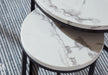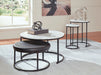 Details | Includes coffee table, 2 end tables and ottoman, Tabletop made with faux Carrara marble laminate and MDF substrate, Tubular metal frame with dark powder coat finish, Ottoman with black faux leather upholstery, Nesting design | |