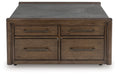 Master the art of mixed-material design with this coffee table. It sports an urban vibe, with faux cement lending an industrial edge to the contrasting dark brown finish. For a functional touch, spacious drawers store essentials for living room lounging in style. Detailed mouldings on the side add even more cool character.