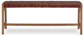Express your sense of contemporary yet comfortable style with this accent bench. Its on-trend frame is accented by brown leather strips in a basket weave pattern for a mid-century modern aesthetic. Tuck this modern gem into an entryway or home office.