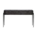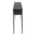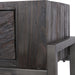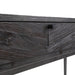 Hand pieced from recycled pine in an updated chevron pattern finished in dark walnut with a subtle gray wash, set into an aged iron wrap around frame. Features inlaid black iron hardware strips with peg pulls. Solid wood will continue to move with temperature and humidity changes, which can result in small cracks and uneven surfaces, adding to its authenticity and character.