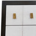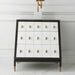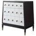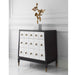 This timeless pyramid shape is updated and reinterpreted to create a fabulous three drawer chest. Appearing to have 15 small drawers in hand scrubbed elm with a finish featuring stylized wood grain hardware and matching feet in a pewter finish. The chest has three solid wood drawers with self closing metal glides. The transitional design and smart proportions allow it to function as a perfect bedside table, hall console, or sofa side table.