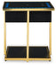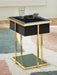 Details Made with engineered wood, glass and metal, Metal frame with goldtone finish, Black glass top, Black polyester fabric on sides, Fixed lower shelf, Tabletop with wireless charging and touch-button controls, 6.5" full-range speaker; 2" tweeter speaker, Wireless connection; aux audio input; MP3 port, USB charging ports (USB-A and USB-C), LED light under tabletop, Power cord included; UL Listed