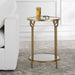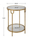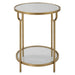 This round, two-tiered side table made of iron, features a mirrored top and tempered glass on bottom. Finished in an antique gold, this table will be perfect with almost any decor.