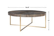 - Contemporary In Style, This Coffee Table Features A Stainless Steel Framework Finished In A Brushed Brass With A Round Acacia Veneer Top In A Dark Walnut Stain Washed With A Light Gray Glaze.