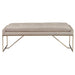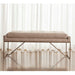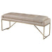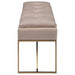 Expertly tailored with modern style in a rich full grain warm latte leather, this accent bench features a plush button tufted seat, atop an angled stainless steel base finished in brushed brass. Because leather is a natural product, both texture and color will vary slightly from hide to hide and within the same hide.