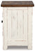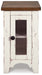 Double take. Sporting a two-tone finish that pairs a distressed vintage white with aged natural pine color, this chairside end table elevates the art of rustic farmhouse living. Enhancing its charm: shelved storage visible through the cabinet door with inset metal grill.