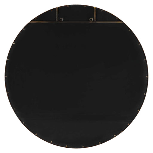UttermostThis Large Round Mirror Showcases A Strap Style Iron Frame Finished In A Sleek Matte Black With Soft Curved Ends That Encompass Antique Gold Column...