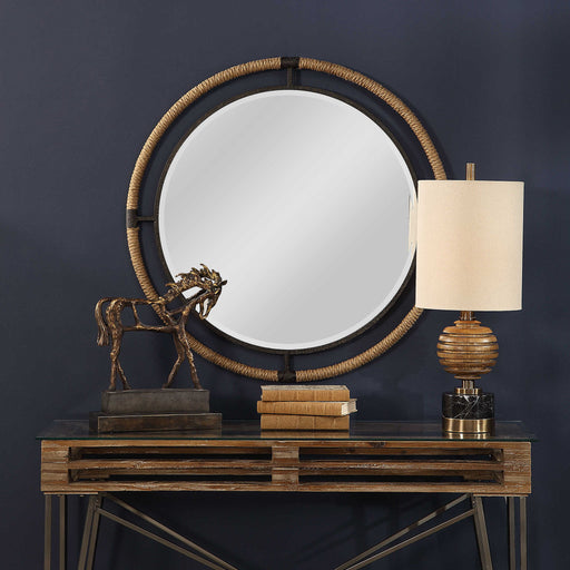 UttermostThis Forged Iron Mirror Frame Is Finished In A Textured Rust Black That's Wrapped In Natural Rope Bringing A Coastal Feel To Any Room. The Round Mi...