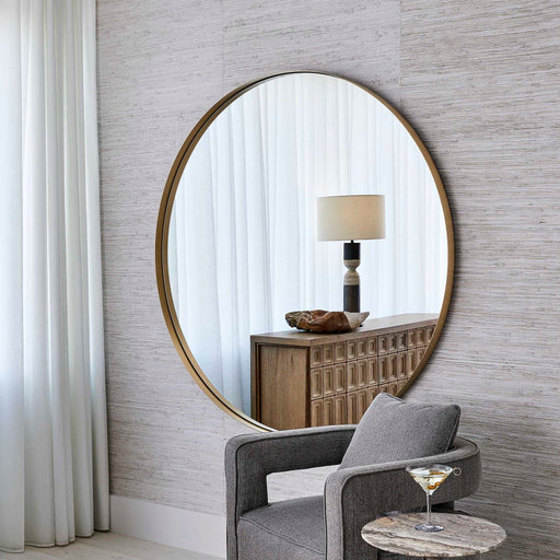 RevelationThis elegant design keeps it simple with a thick steel strap frame, finished in a plated metallic. Padria - 40" Round Mirror - Brass40.0"W x 2.25"D...