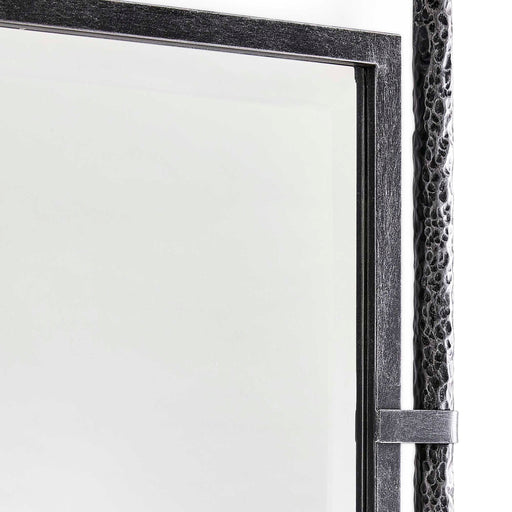 RevelationThe center steel frame is suspended between two hand-forged textured legs. The mirror has a generous 1.25" bevel. Can be hung or leaned against a w...