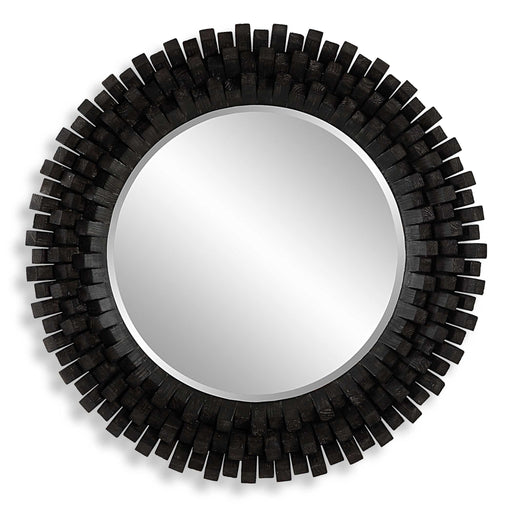 UttermostThis Round Wood Mirror Has A Contemporary Rustic Flair By Featuring Angled Pillars Of Solid Wood Stacked In Alternating Heights For A Dramatic And ...