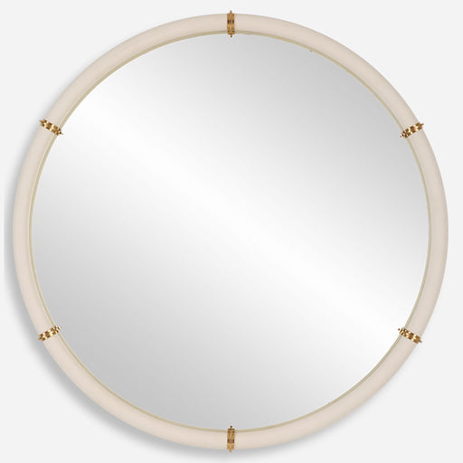 UttermostThe Cyprus Round Mirror Showcases A White Faux Shagreen Leather Wrap Featuring Brass Plated Steel Bands That Help Elevate This Sophisticated Design...